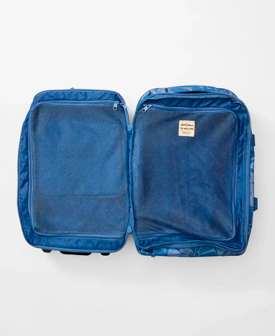 Valija Rip Curl F-Light 45L. POLIÉSTER RECICLADO Cierre con cremallera. Compartimento para portátil. Base de EVA moldeada por compresión. Correas de compresión externas. Asa telescópica. Ruedas de patines en línea. Cremalleras bloqueables. Funda especialmente diseñada para el accesorio AirTag (AirTag es una marca registrada de Apple Inc).